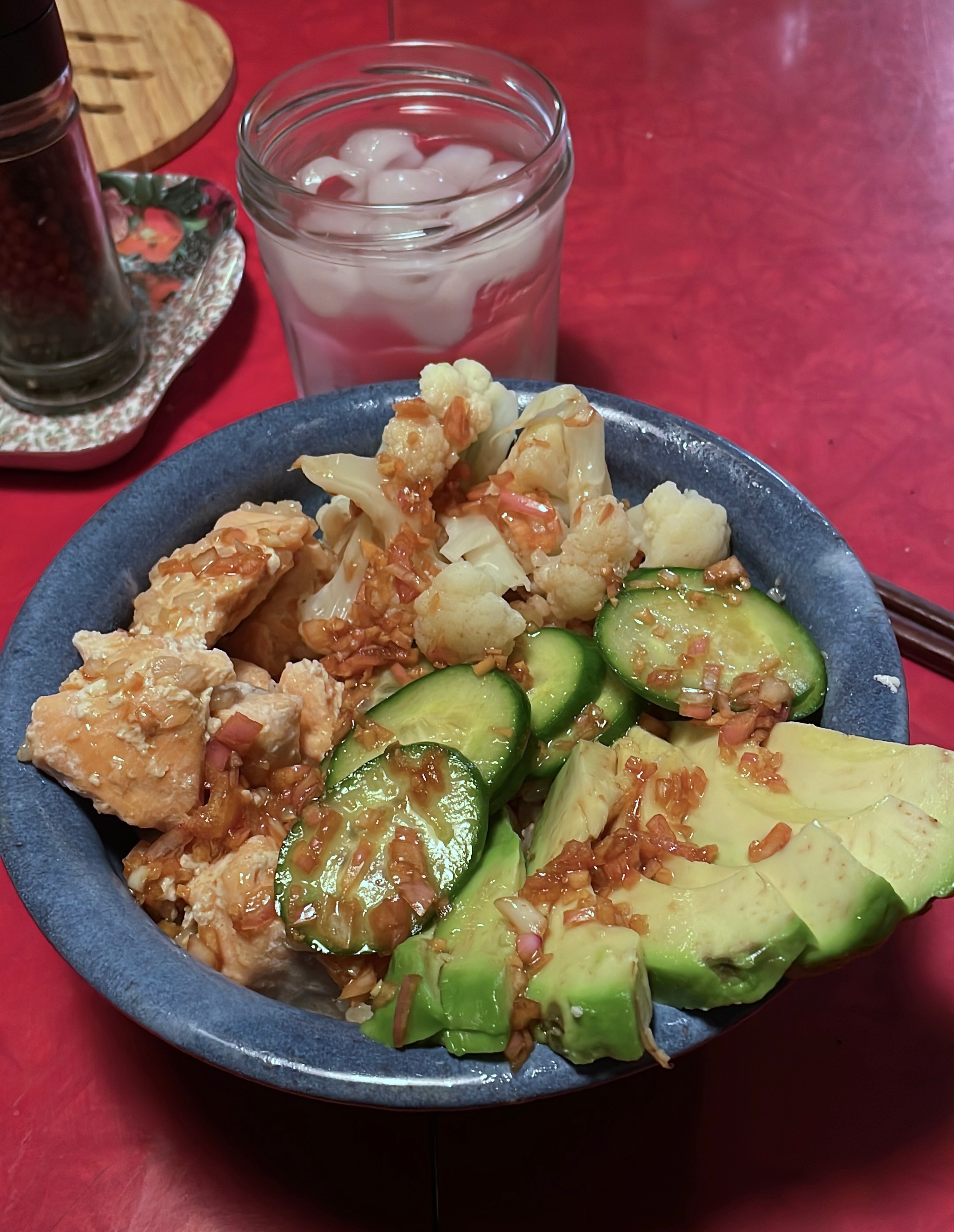 Scoop salmon and rice into bowls. Top each with some cucumbers, coleslaw mix and avocado. Drizzle with the vinaigrette. Top with nori, if using.